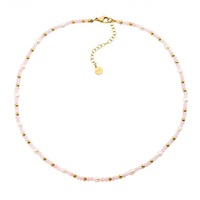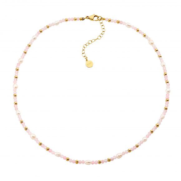 Ellani Rose quartz beads with freshwater pearls, gold IP plated stainless steel necklace.
